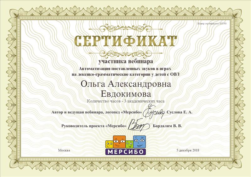 | Участник вебинара "Автоматизация поставленных звуков в играх на лексико-грамматические категории у детей с ОВЗ", (3 часа) 05.12.2018 г. |