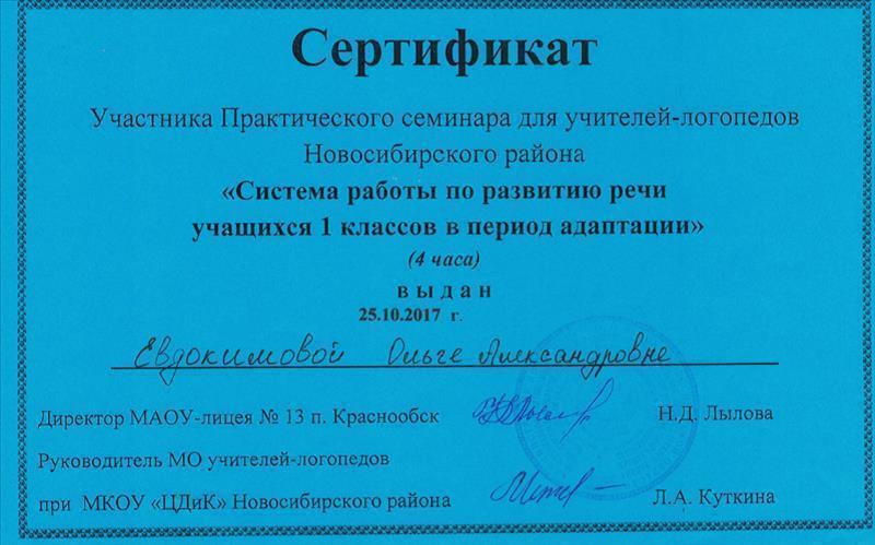 | Сертификат участника практического семинара для учителей-логопедов Новосибирского района "Система работы по развитию речи учащихся 1 классов в период адаптации" (4 часа), 25.10.2017 г. |