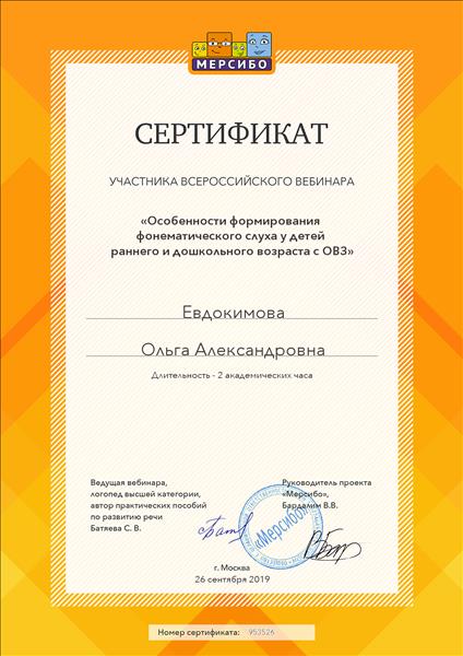 | Участник Всероссийского вебинара: "Особенности формирования фонематического слухау детей раннего и дошкольного возраста с ОВЗ", (2 часа) 26.09.2019 г. |