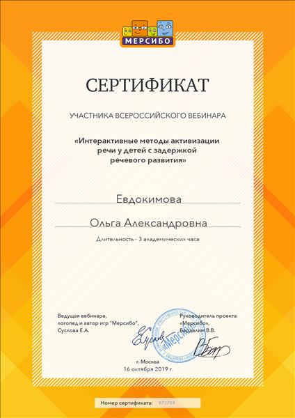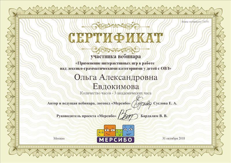 | Участник вебинара «Применение интерактивных игр в работе над лексико-грамматическими категориями у детей с ОВЗ» (3 часа) 31.10.2018 г. |