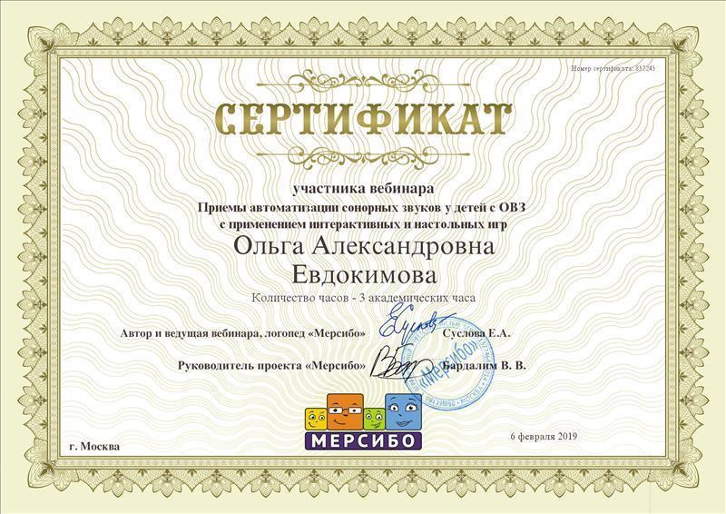 | Участник вебинара: "Приемы автоматизации сонорных звуков у детей с ОВЗ с применением интерактивных и настольных игр", (3 часа) 06.02.2019 г. |