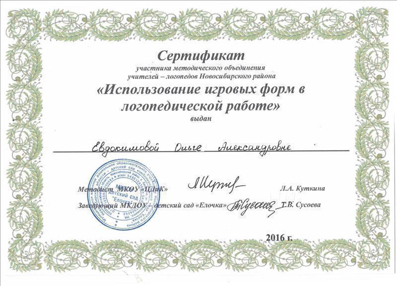 | Сертификат участника практического семинара для учителей-логопедов Новосибирского района "Использование игровых форм в логопедической работе", 2016 г. |