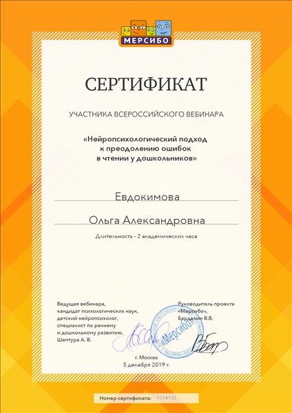 | Участник Всероссийского вебинара «Нейропсихологический подход к преодолению ошибок в чтении дошкольников» (2 часа), 05.12.2019 г. |