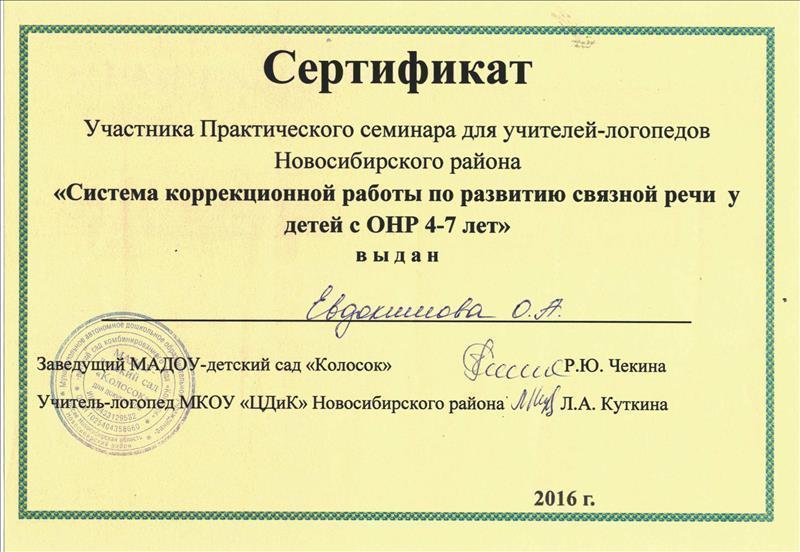| Сертификат участника практического семинара для учителей-логопедов Новосибирского района "Система коррекционной работы по развитию связной речи у детей с ОНР 4 - 7 лет", 2016 г. |