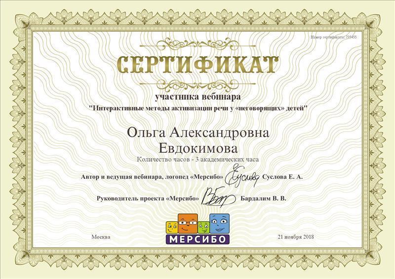 | Участник вебинара: «Интерактивные методы активизации речи у «неговорящих детей», (3 часа) 21.11.2018 г. |