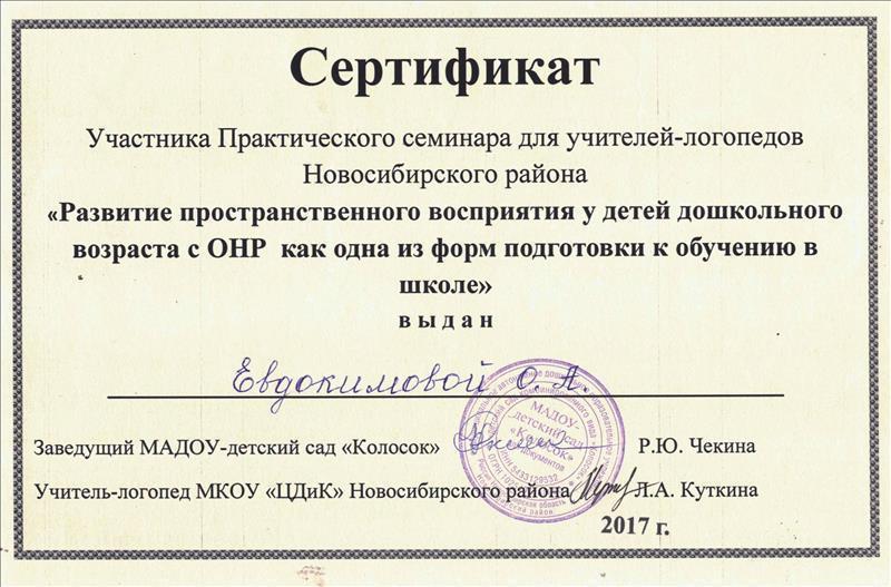| Сертификат участника практического семинара для учителей-логопедов Новосибирского района "Развитие пространственного восприятия у детей дошкольного возраста с ОНР как одна из форм подготовки к обучению к школе", 2017 г. |