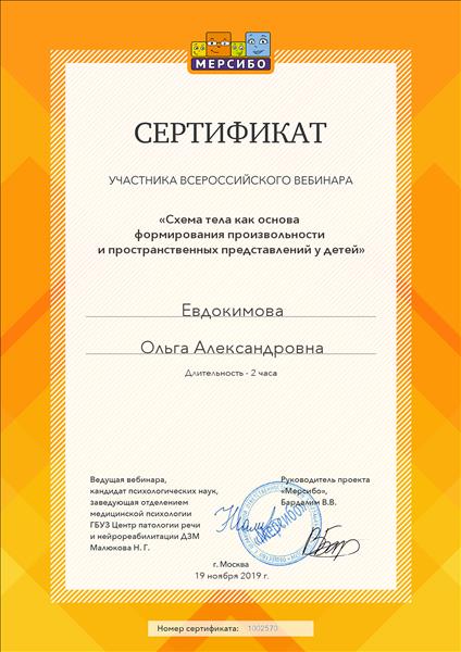 | Участник Всероссийского вебинара: "Схема тела как основа формирования произвольности и пространственных представлений у детей" (2 часа), 19.11.2019 г. |