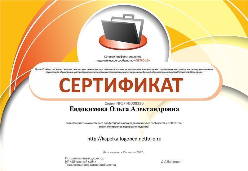 | Сертификат участника сетевого профессионального педагогического сообщества "NETFOLIO". |