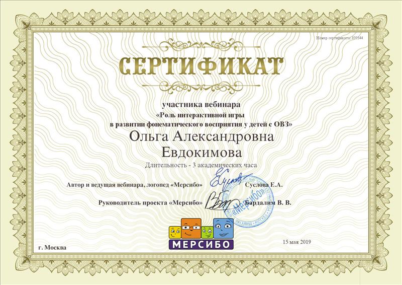 | Участник вебинара: "Роль интерактивной игры в развитии фонематического восприятия у детей с ОВЗ", (3 часа) 15.05.2019 г. |