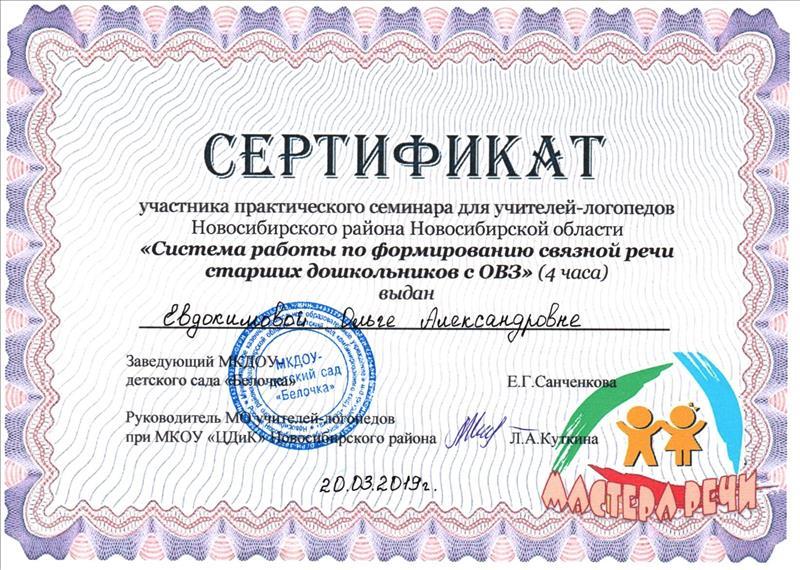 | Сертификат участника практического семинара для учителей-логопедов Новосибирского района Новосибирской области "Система работы по формированию связной речи старших дошкольников с ОВЗ", (4 часа) 20.03.2019 г. |