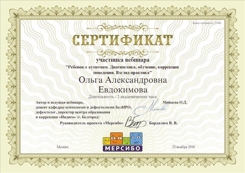 | Участник вебинара: «Ребенок с аутизмом. Диагностика, обучение, коррекция поведения. Взгляд практика», (2 часа) 22.11.2018 г. |