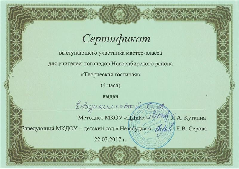 | Сертификат выступающего участника мастер-класса для учителей-логопедов Новосибирского района "Творческая гостиная" (4 часа), 22.03.2017 г. |
