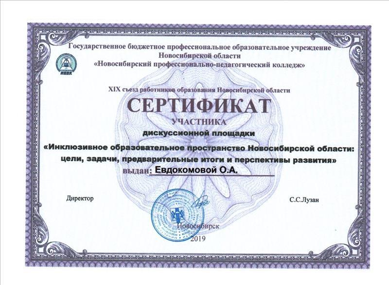 | ГБПОУ НСО "Новосибирский профессионально-педагогический колледж". XIX съезд работников образования Новосибирской области сертификат участника дискуссионной площадки "Инклюзивное образовательное пространство Новосибирской области: цели, задачи, предварительные итоги и перспективы развития", 23.08.2019 г. |