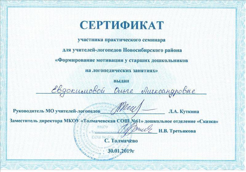 | Сертификат участника практического семинара для учителей-логопедов Новосибирского района "Формирование мотивации у старших дошкольников на логопедических занятиях", 30.01.2019 г. |