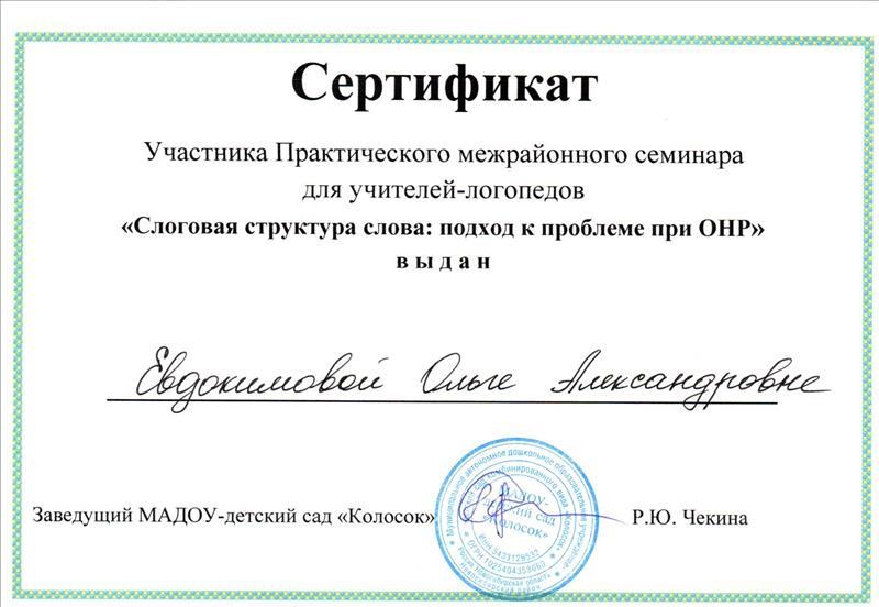 | Сертификат практического межрайнного семинара для учителей-логопедов "Слоговая структура слова: подход к проблеме при ОНР", 17.04.2019 г. |