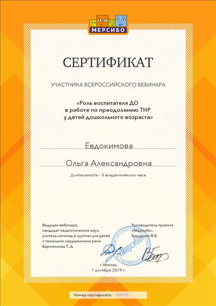 | Участник Всероссийского вебинара: "Роль воспитателя ДО в работе по преодолению ТНР у детей дошкольного возраста", (3 часа) 01.10.2019 г. |
