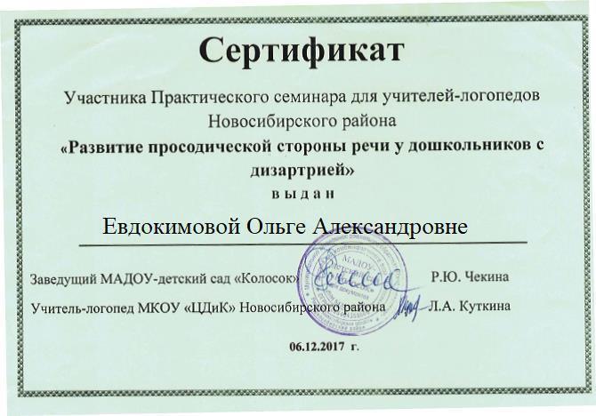 | Сертификат участника практического семинара для учителей-логопедов Новосибирского района "Развитие просодической стороны речи у дошкольников с дизартрией", 06.12.2017 г. |