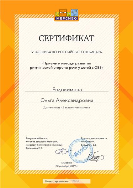 | Участник Всероссийского вебинара: "Приемы и методы развития ритмической стороны речи у детей с ОВЗ", (2 часа) 20.10.2019 г. |