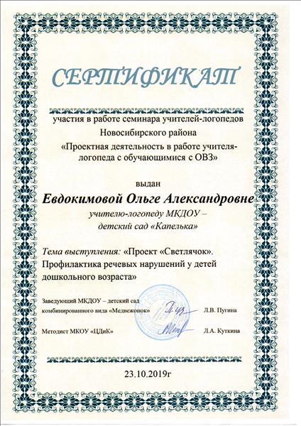 | Сертификат участия в работе семинара учителей-логопедов Новосибирского района "Проектная деятельность в работе учителя-логопеда с обучающимися с ОВЗ". Тема выступления: "Проект "Светлячок". Профилактика речевых нарушений у детей дошкольного возраста", 23.10.2019 г. |