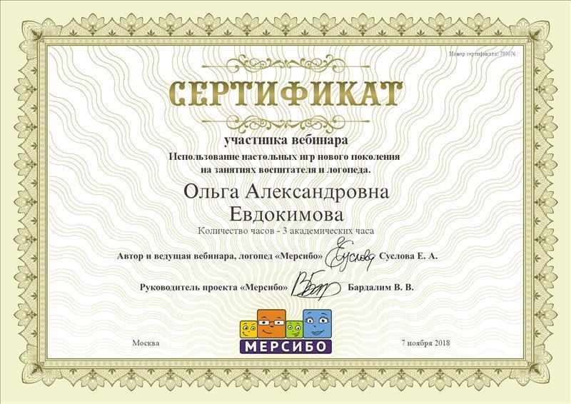 | Участник вебинара: «Использование настольных игр нового поколения на занятиях воспитателя и логопеда», (3 часа) 07.11.2018 г. |