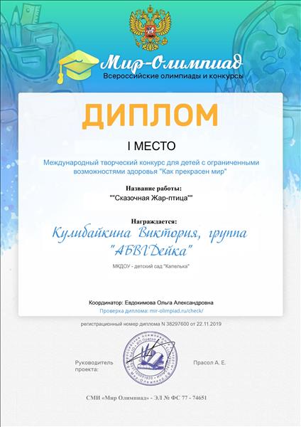 Международный творческий конкурс для детей с ОВЗ «Как прекрасен этот мир». Название работы «Сказочная Жар-птица».