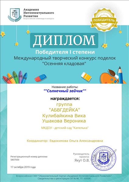 Диплом победителя 1 степени. Международный творческий конкурс поделок «Осенняя кладовая». Конкурсная работа «Солнечный зайчик».